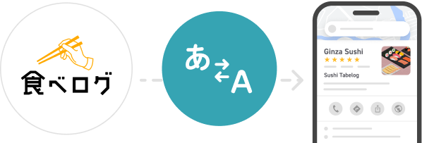食べログの管理画面で店舗情報(基本情報・メニュー)を更新すると、その内容がGoogle マップで表示される店舗情報に日本語と3つの言語(※1)で自動反映されます。